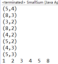 package Solution;public class ReSequen{public static void main(String[] args) {int[] array= {1,5,4,8,3,2};mergeSort(array);for(int i=0;i> 1);/** mid=(L+R)/2不安全,因为R+L可能会溢出,然后除以2结果可能会不准确* mid=L+(R-L)/2是安全的;* a/2=a>>1(一个数除以2,等于它右移一位)* 所以mid=L+(R-L)>>1;* 用右移的原因:位运算比算术运算快很多*/sortProcess(arr,L,mid);sortProcess(arr,mid+1,R);merge(arr,L,mid,R);}public static void merge(int[] arr,int L,int mid,int R) {//注意此处的R是末尾元素的位置,不是长度int[] result=new int[R-L+1];//所以此处求长度应+1int p1=L;int p2=mid+1;int i=0;while(p1<=mid&&p2<=R) {//所以此处比较应该包含mid和R,就是≤,而不是<if(arr[p1]>arr[p2])for(int k=p1;k<=mid;k++)System.out.println("("+arr[k]+","+arr[p2]+")");result[i++]=arr[p1]
