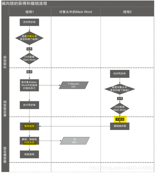 线程1演示了偏向锁初始化的流程,线程2演示了偏向锁撤销的流程。