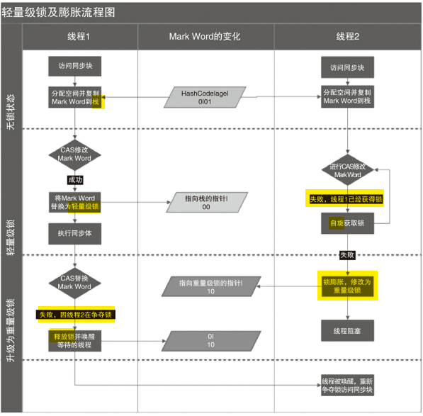 轻量级解锁时,会使用原子的CAS操作将Displaced Mark Word替换回到对象头,如果成功,则表示没有竞争发生。如果失败,表示当前锁存在竞争,锁就会膨胀成重量级锁。下图是两个线程同时争夺锁,导致锁膨胀的流程图。