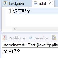 import java.io.IOException;public class Test{public static void main(String[] args) throws IOException {FileOutputStream fo=new FileOutputStream("a.txt");BufferedOutputStream bos=new BufferedOutputStream(fo);bos.write("你在吗?".getBytes());bos.close();fo.close();}