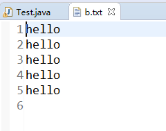 import java.io.IOException;public class Test{public static void main(String[] args) throws IOException {BufferedWriter out=new BufferedWriter(new FileWriter("b.txt"));String line=null;for(int i=0;i<5;i++) {out.write("hello");out.newLine();}out.close();}