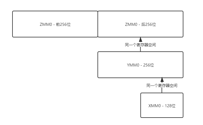值得一提的是,AVX512的ZMM寄存器和AVX2的YMM寄存器有着重叠的关系,AVX2的YMM寄存器组和SSE的XMM寄存器组同样存在着重叠的关系。