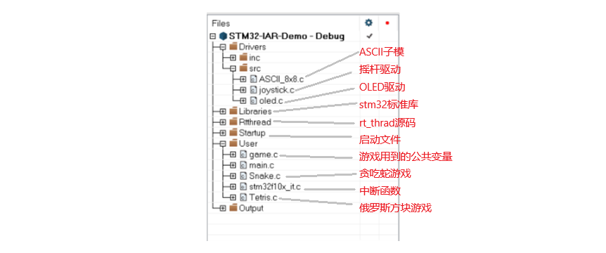 前言:本实现基于stm32芯片,移植RT_Thread Nano系统源码,实现两个小游戏(贪吃蛇/俄罗斯方块)。本实验提供完整的IAR工程源码并且有很多注释,是一个不错的参考例程。关键知识点:OLED驱动,ADC采样,游戏逻辑设计,RT_Thread移植。