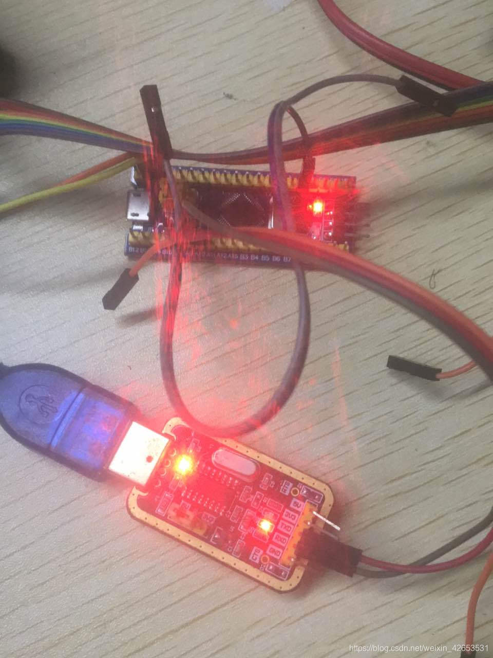 将所有文件创建好了之后,编译下载到开发板。用杜邦线将PA.0接到PA.8,串口线连接到USB转接口,给开发板上电。