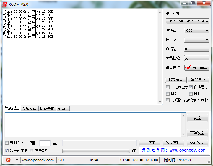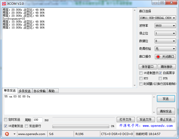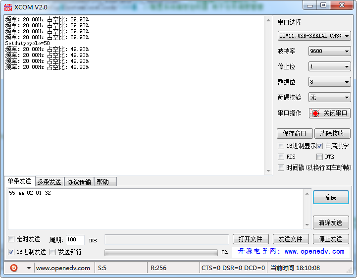 通过串口发送命令>>55 aa 02 01 32 (将占空比设置为50%),要注意以16进制发送,可观察到占空比发生了改变: