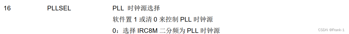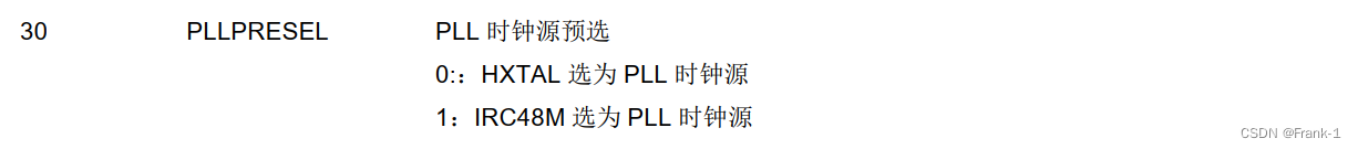 ② PLLPRESEL选择外部晶振作为PLL时钟源,经过PREDV分频,PLLSEL选择外部晶振作为PLL时钟源,经过PLL倍频得到CK_PLL,再通过SCS选择PLL时钟源作为系统时钟。