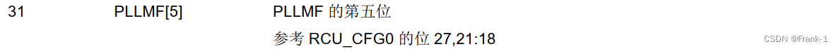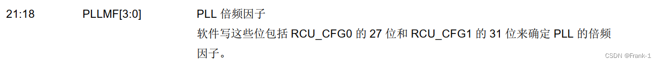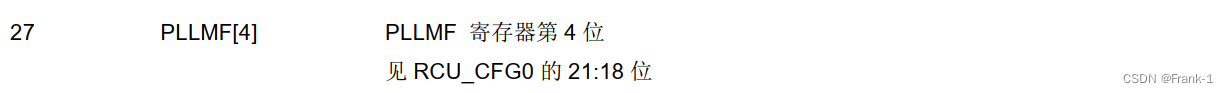 由RCU_CFG0寄存器21-18位的PLLMF[3,0],RCU_CFG0寄存器的27位 PLLMF[4],RCU_CFG1寄存器的31位 PLLMF[5]共同决定。