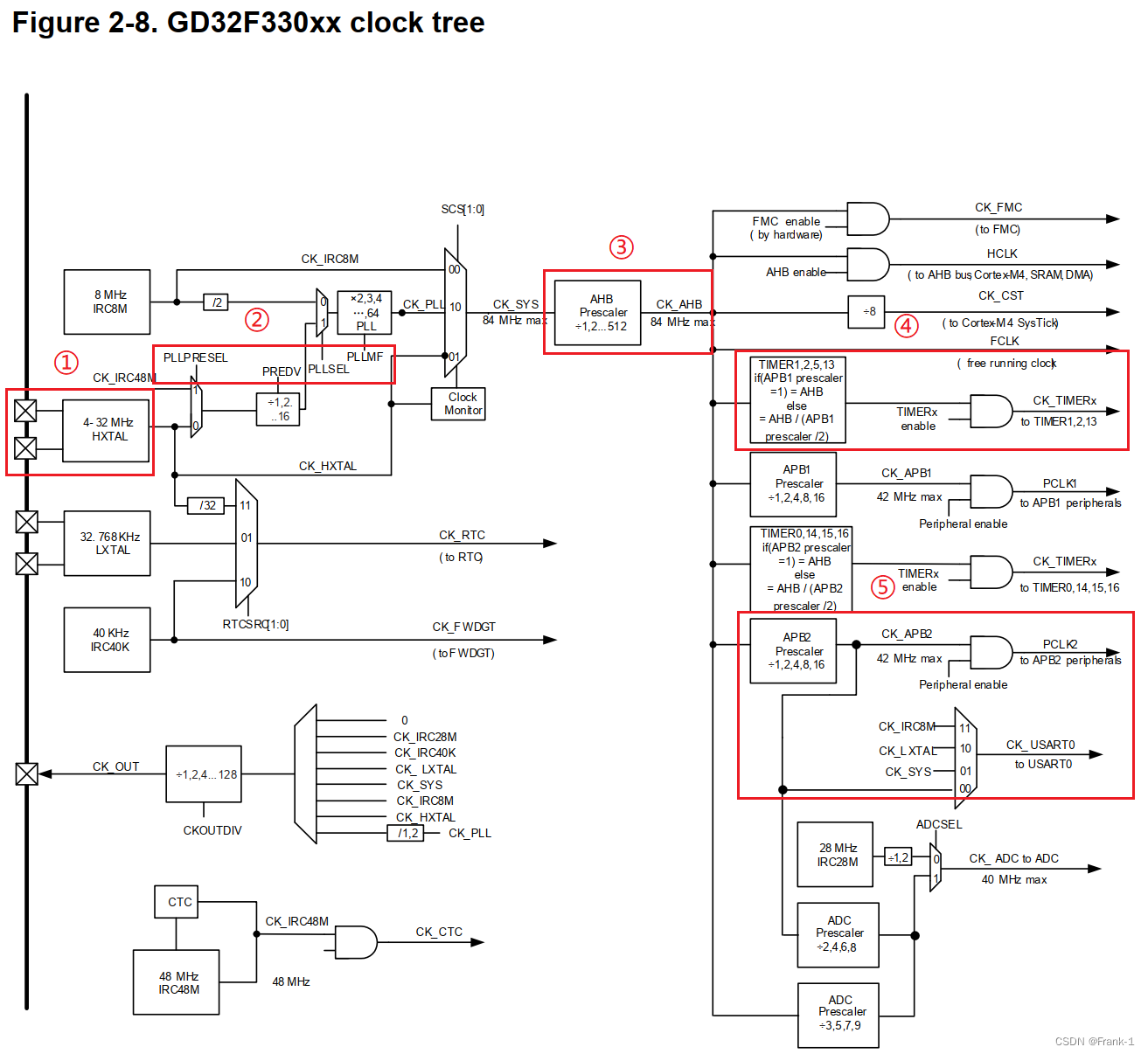⑤ 以USART0为例,USART0挂载APB2总线,通过APB2分频得到CK_APB2频率直接提供USART0使用。