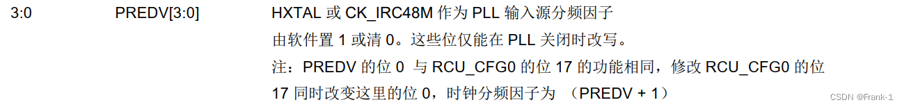 由RCU_CFG1寄存器3-0位的PREDV[3,0]决定,同时CU_CFG0寄存器的第17位和PREDV的第0位功能相同。