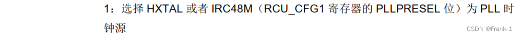 {uint32_t timeout = 0U;uint32_t stab_flag = 0U;/* enable HXTAL */RCU_CTL0 |= RCU_CTL0_HXTALEN;/* wait until HXTAL is stable or the startup time is longer than HXTAL_STARTUP_TIMEOUT */do {timeout++;stab_flag = (RCU_CTL0 & RCU_CTL0_HXTALSTB);} while((0U == stab_flag) && (HXTAL_STARTUP_TIMEOUT != timeout));/* if fail */if(0U == (RCU_CTL0 & RCU_CTL0_HXTALSTB)) {return;}/* HXTAL is stable *//* AHB = SYSCLK */RCU_CFG0 |= RCU_AHB_CKSYS_DIV1;/* APB2 = AHB/2 */RCU_CFG0 |= RCU_APB2_CKAHB_DIV2;/* APB1 = AHB/2 */RCU_CFG0 |= RCU_APB1_CKAHB_DIV2;/* PLL = HXTAL /4 * 21 = 84 MHz */RCU_CFG0 &= ~(RCU_CFG0_PLLSEL | RCU_CFG0_PLLMF | RCU_CFG0_PLLMF4 | RCU_CFG0_PLLPREDV); //16,27|(18,21),27,17RCU_CFG1 &= ~(RCU_CFG1_PLLPRESEL | RCU_CFG1_PLLMF5 | RCU_CFG1_PREDV); //30,31,(0,3)RCU_CFG0 |= (RCU_PLLSRC_HXTAL_IRC48M | (RCU_PLL_MUL21 & (~RCU_CFG1_PLLMF5))); //16,RCU_CFG1 |= (RCU_PLLPRESEL_HXTAL | RCU_PLL_PREDV4); //设置RCU_CFG1寄存器PREDV[3:0]预分频系数RCU_CFG1 |= (RCU_PLL_MUL21 & RCU_CFG1_PLLMF5); //RCU_CFG1_PLLMF5实际表示的是 :RCU_CFG0 的位 27,21:18/* enable PLL */RCU_CTL0 |= RCU_CTL0_PLLEN;/* wait until PLL is stable */while(0U == (RCU_CTL0 & RCU_CTL0_PLLSTB)) {}/* select PLL as system clock */RCU_CFG0 &= ~RCU_CFG0_SCS;RCU_CFG0 |= RCU_CKSYSSRC_PLL;/* wait until PLL is selected as system clock */while(0U == (RCU_CFG0 & RCU_SCSS_PLL)) {}