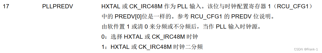 由 RCU_CFG1寄存器的第30位 PLLPRESEL决定 ,或由RCU_CFG0寄存器的第17位PLLPREDV决定。