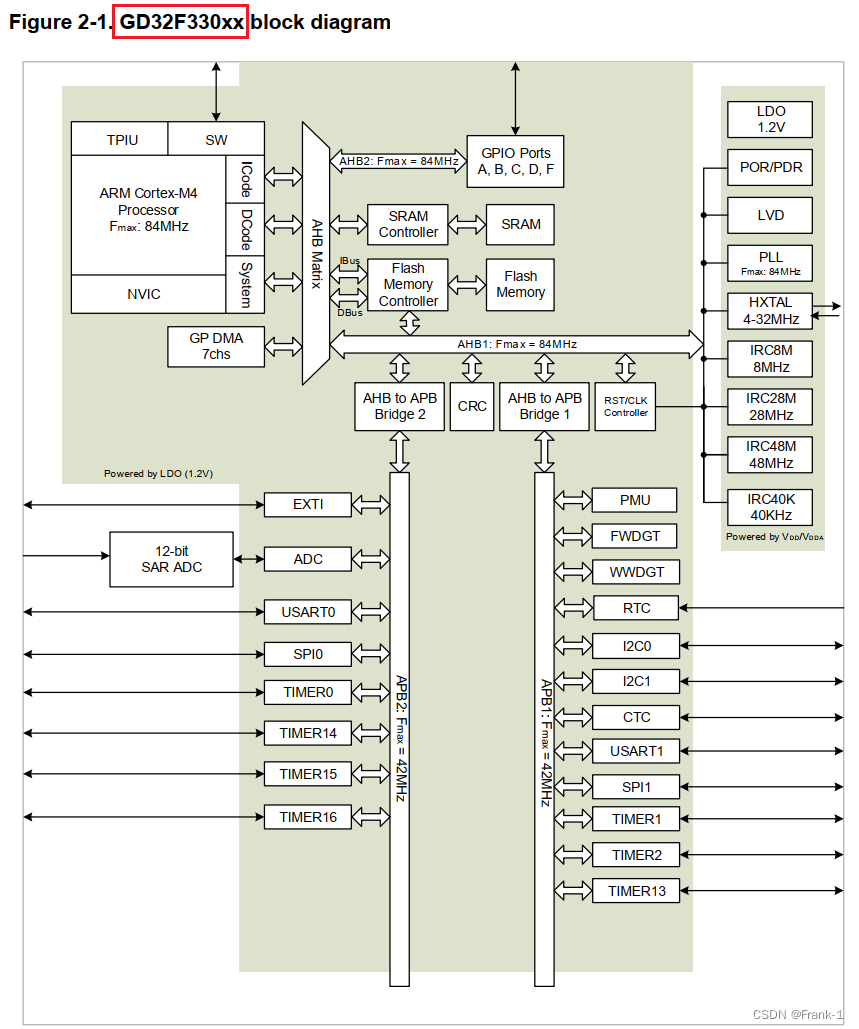 以GD32F330系列为例,Cortex-M4架构,最高时钟频率为84MHz。