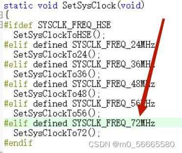3、在该函数中找到设置的时钟频率对应选项。在以72MHz为例如图4所示。由于定义了“SYSCLK_FREQ_72MHz”是的系统时钟频率为72MHz。其他频率同理。