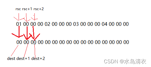 最后,我们的num就发挥作用了,首先整形数组一个元素4个字节而我们知道,第一个元素1在内存中是以01 00 00 00的方式存储,01就是第一个字节的内容,00就是第二个字节的内容,以此类推,02 00 00 00中的02就是第五个字节的内容,让num即读取数据大小的数字不断--,直到num为0,读取了20个字节的大小,同时也拷贝了20个字节的大小内容,这个时候0为假,while的循环就被跳出去了,最后返回一开始的目的地地址,这样我们内存的操作就算完成啦