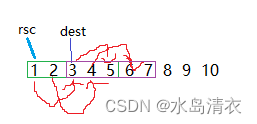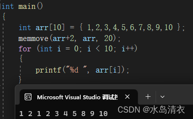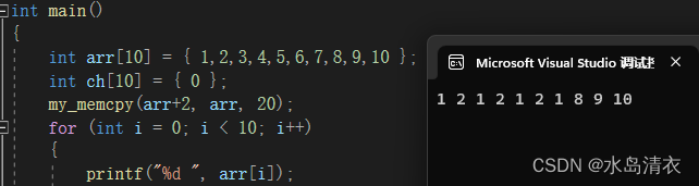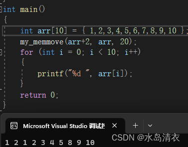{int arr[10] = { 1,2,3,4,5,6,7,8,9,10 };my_memmove(arr+2, arr, 20);for (int i = 0; i < 10; i++){printf("%d ", arr[i]);}return 0;