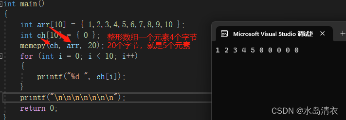 {int arr[10] = { 1,2,3,4,5,6,7,8,9,10 };int ch[10] = { 0 };memcpy(ch, arr, 20);for (int i = 0; i < 10; i++){printf("%d ", ch[i]);}return 0;