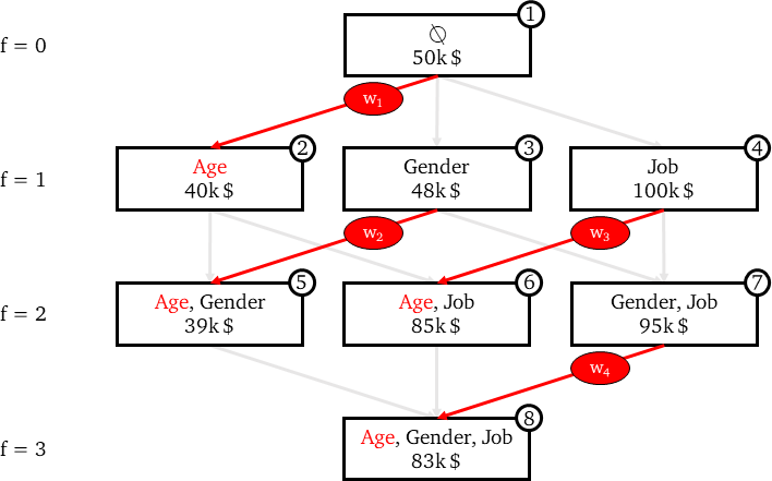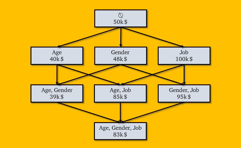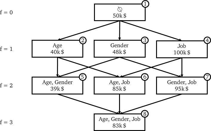 因此,每条边代表一个特征对模型的边际贡献。假设我们在节点1中,节点1是一个没有任何特征的模型。该模型将简单地预测所有训练观察样本值的平均收入(50k美元)。如果我们到了节点2,这是一个模型只有一个特征(年龄),现在对x₀的预测为40k美元。这意味着知道x₀的年龄降低了我们的预测10k美元。