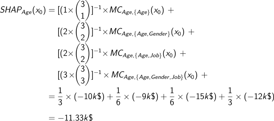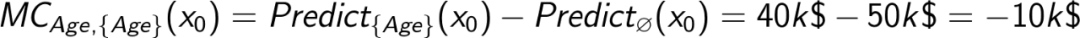 因此,年龄对只包含年龄作为特征的模型的边际贡献是-10k$。公式: