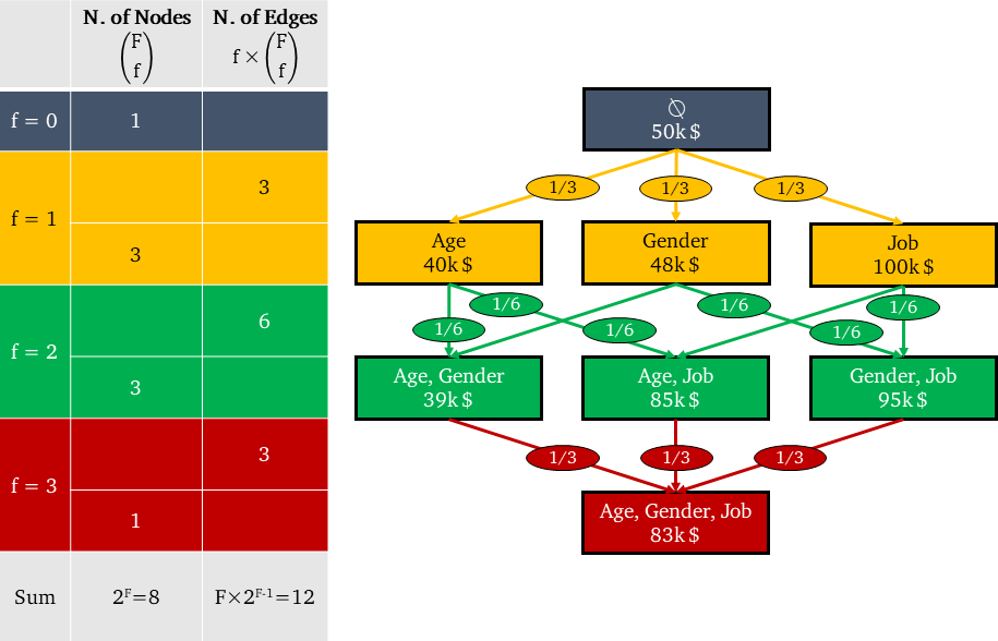 Shapley值是基于这样一种想法,即应该考虑每个玩家可能的组合的结果来决定单个玩家的重要性。在我们的例子中,这对应于f特征的每个可能组合(f从0到F, F是所有可用特征的数量)。