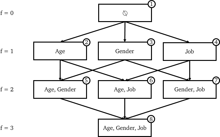 我们从数学上知道一个幂集的容量是2^n^,其中n是原始集合的元素个数。实际上,在我们的例子中,我们有2^F^ = 2^3^= 8个可能的特征的组合。