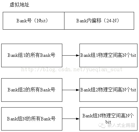 6) 通过以上约定和分析,可以知道,对于一个虚拟地址,是可以知道它是属于哪个 Bank组的,而通过Bank组和Bank内偏移是可以确定它在内存中的确切地址,也意味着它实现MMU中的页表的功能。如下图: