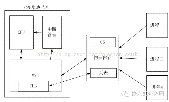 在阐述控制器领域的内存管理之前,还是要先介绍处理器领域的虚拟内存管理机制,前者很大程度上是对后者核心机制精髓的借鉴。实现虚拟内存管理有几个模块是协调工作的:CPU、MMU、操作系统、物理内存,如图示(假设该芯片系列没有cache):
