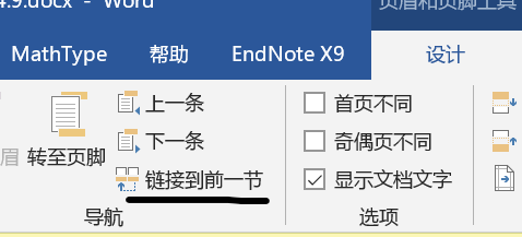 双击页眉后,上方菜单栏会多出一栏设计,其中的链接到前一节就是控制页眉是否与前一节保持一致,当它选中时两节(注意不是两页)页眉相同