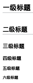 1 2 3 4 5 6 | h1.一级标题 h2.二级标题 h3.三级标题 h4.四级标题 h5.五级标题 h6.六级标题 |