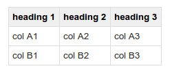 1 2 3 | ||heading 1||heading 2||heading 3|| |col A1|col A2|col A3| |col B1|col B2|col B3| |