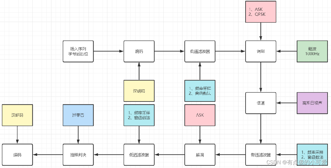 发哥里面的源码文件是我们在另外一个博主那里找到的,源码没做太大改变,实现了振幅键控(ASK)的基本过程。不加汉明码和加汉明码文件里的源码则是我修改过的,有个不太完善的QPSK调制,以及不太完善的汉明码编码译码过程。如果有大佬看懂并完善了,请一定要CALL我!