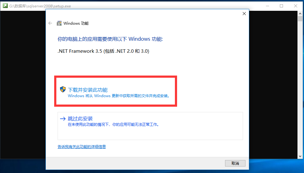2.如果是首次安装,需要安装.NET Framework 3.5,点击“下载并安装此功能”;如果是卸载重装,请选择“跳过此安装”。