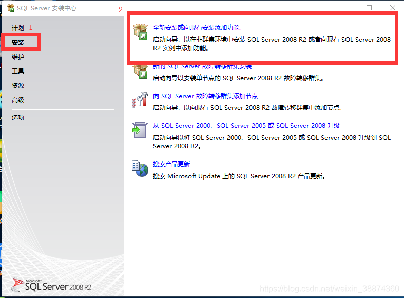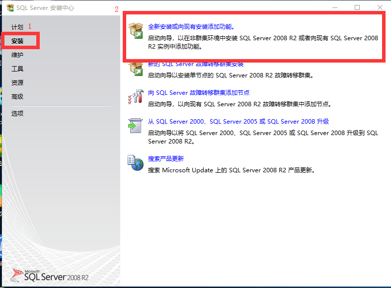 4.等待出现sql server安装中心时,选择“安装”,再点击“全新安装或现有安装添加功能”