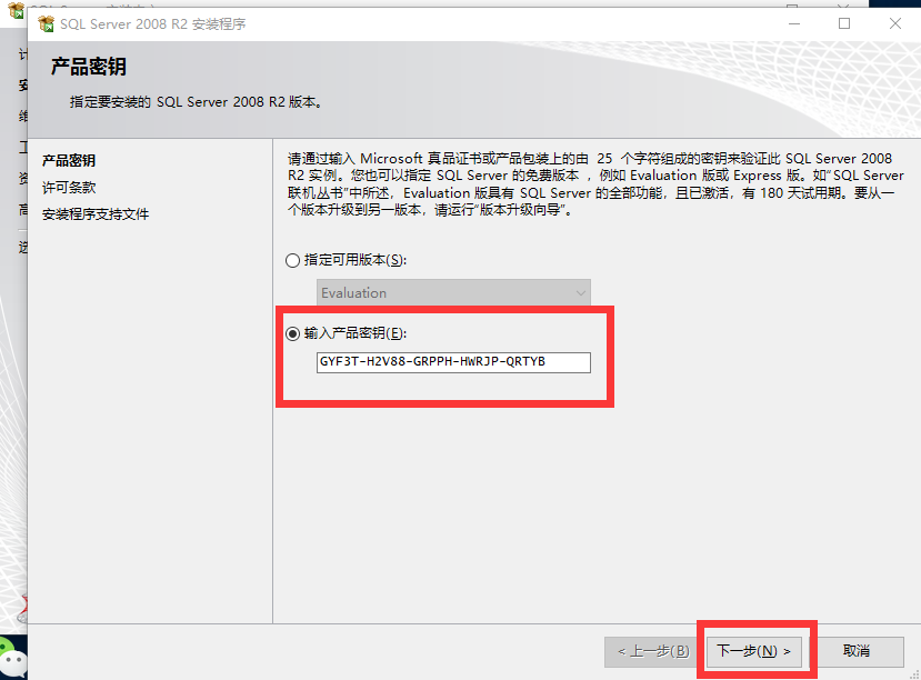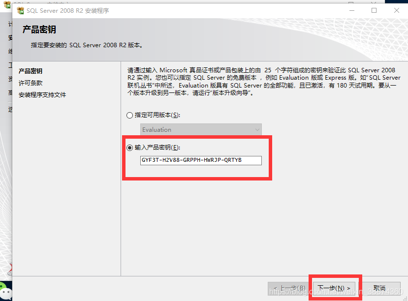 6.再产品密钥中,选择“输入产品密钥”,密钥为:GYF3T-H2V88-GRPPH-HWRJP-QRTYB。然后点击“下一步”