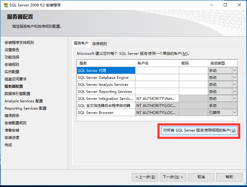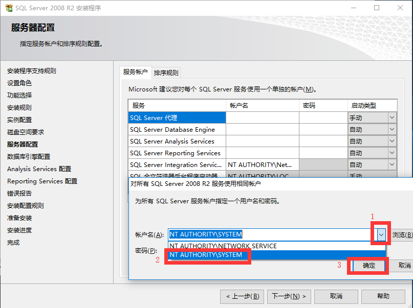 15.点击“对所有SQL Server服务使用相同的账户(U)”,在弹出的对话框中,点击账户名(A)后边的下拉框,选择“NT AUTHORITY\SYSTEM”,密码输入框不用填写,然后点击“确定”按钮,再点击“下一步”。