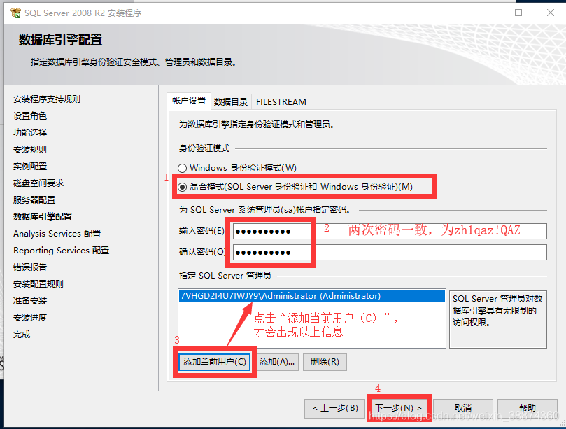 16.选择“混合模式(SQL Server身份验证和Windows身份验证)(M)”,输入密码为:任意字符,然后再点击“添加当前用户(C)”按钮,最后点击“下一步”