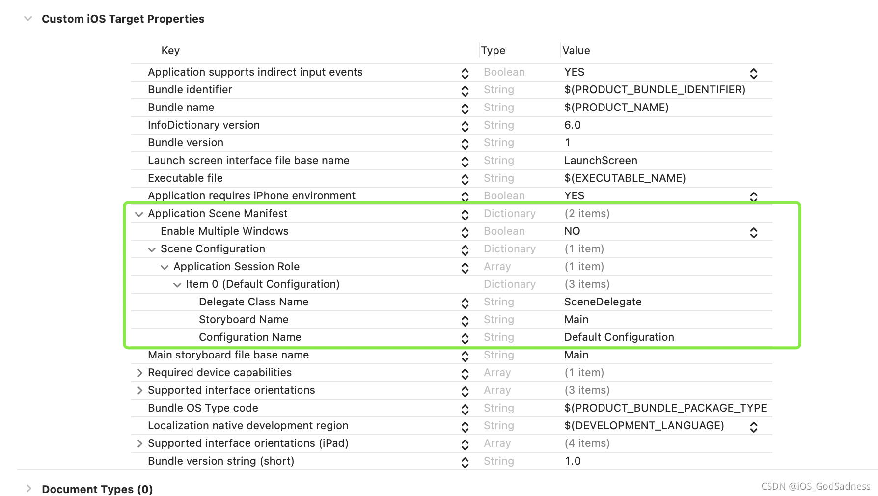 3、修改plist文件中关于SceneDelegate的配置,直接将Application Scene Manifest所对应的配置删除