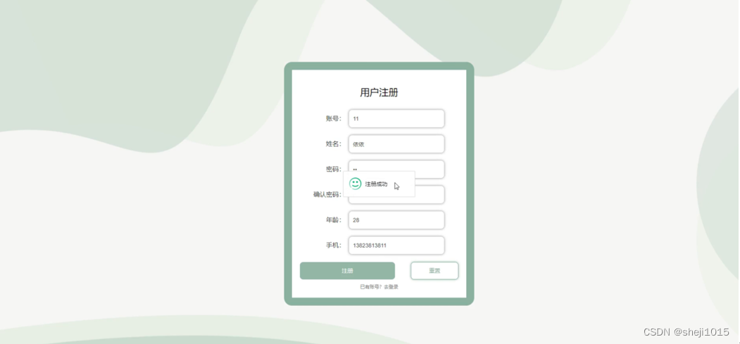 用户注册,在用户注册页面通过填写账号,姓名,密码,确认密码,年龄,手机等信息进行注册操作,如图5-3所示。