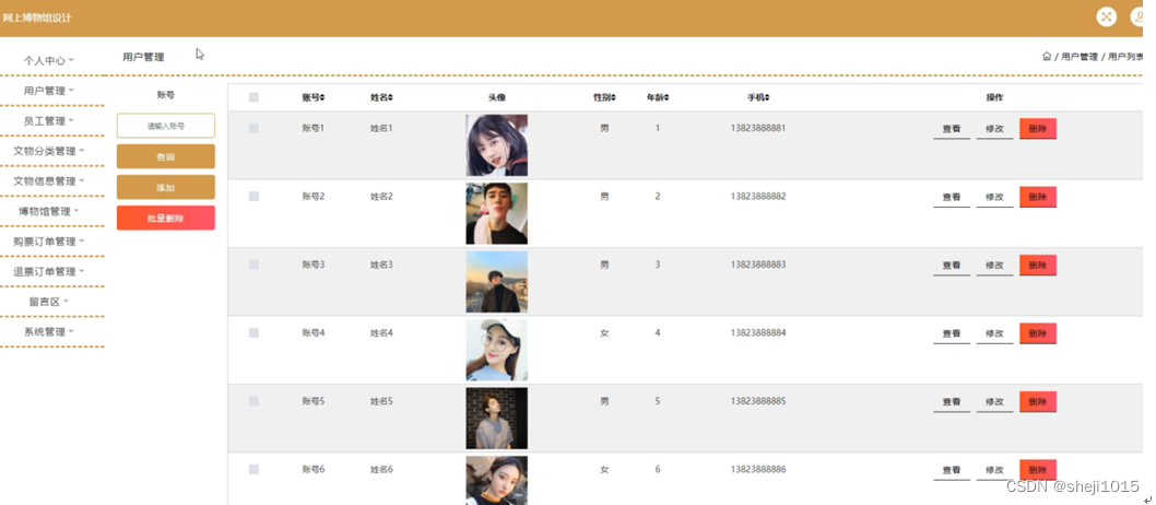 用户管理,在用户管理页面可以对账号,姓名,头像,性别,年龄,手机等内容进行查看,修改,删除操作,如图5-8所示。