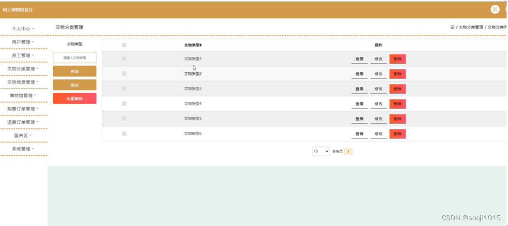 文物分类管理,在文物分类管理页面可以对文物类型信息进行查看,修改,删除操作,如图5-10所示。