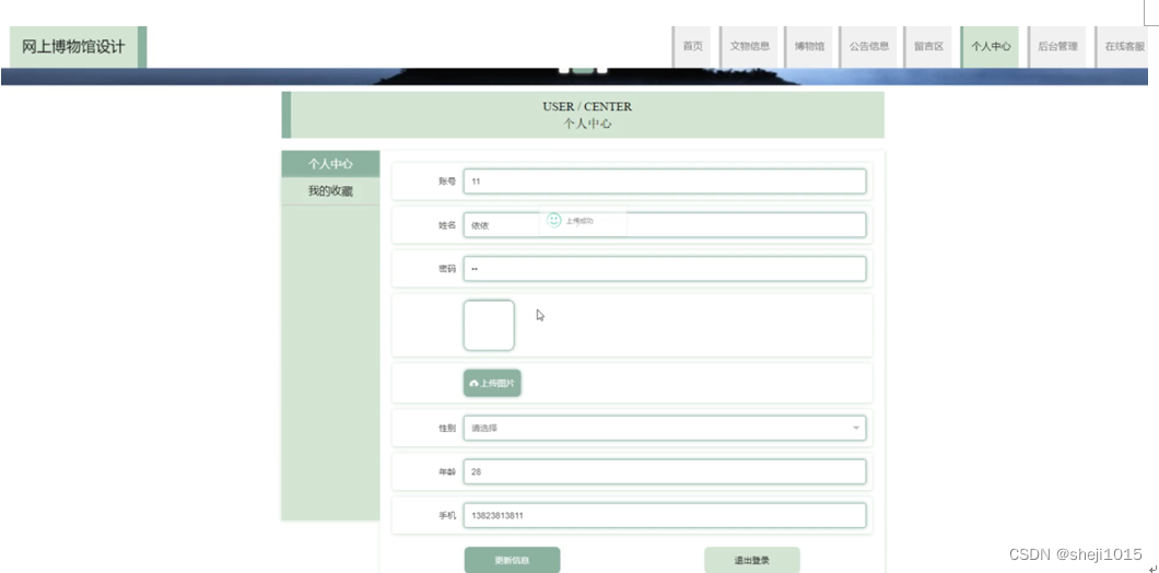 个人中心,在个人中心页面通过填写账号,姓名,密码,上传图片,性别,年龄,手机等内容进行更新信息操作,还可以对我的收藏进行详细操作;如图5-6所示。