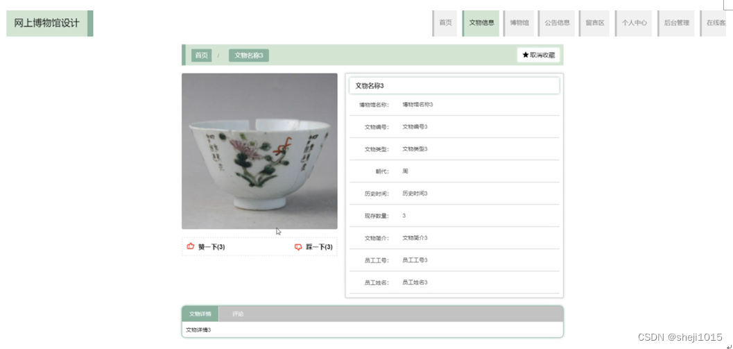 文物信息,在文物信息页面可以查看文物名称,博物馆名称,文物编号,文物类型,朝代,历史时间,现存数量,文物简介,员工工号,员工姓名,文物详情等内容,并进行评论,收藏操作,如图5-4所示。