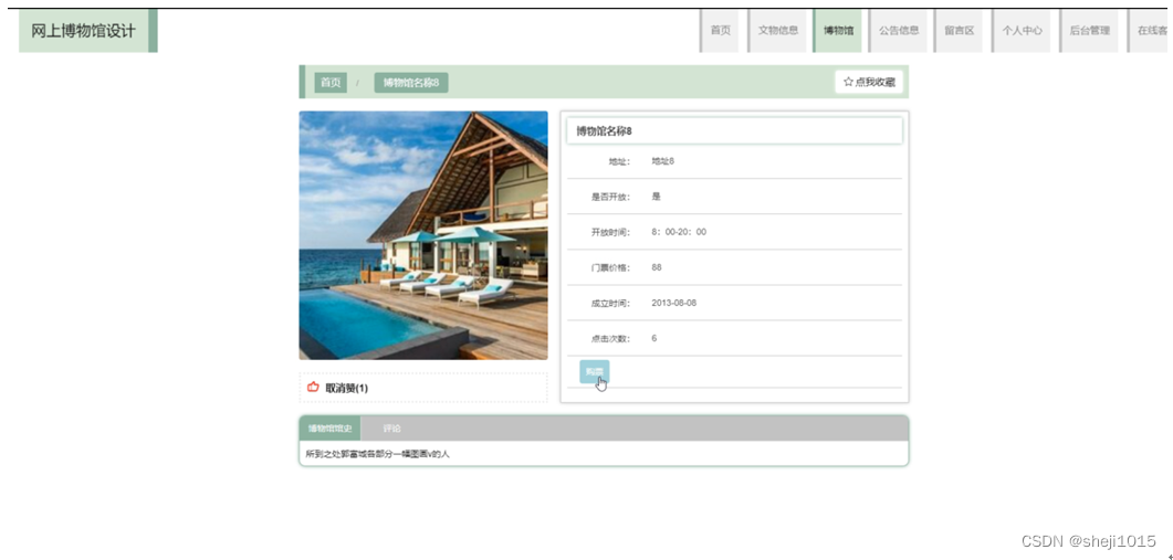 博物馆,在博物馆页面可以查看博物馆名称,地址,图片,是否开放,开放时间,门票价格,成交时间,点击次数,博物馆馆史等内容,并进行购票,评论和收藏操作如图5-5所示。