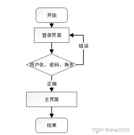 运行系统,首先进入登录界面,按照登录界面的要求填写相应的“用户名”和“密码”以及用户类型,点击“登录”然后系统判断填写是否正确,若正确进入相应的界面,否则给出要求先注册信息。具体流程如图5-1所示