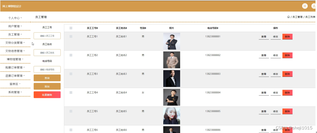 员工管理,在员工管理页面可以对员工工号,员工姓名,性别,照片,电话号码等信息进行查看,修改,删除操作,如图5-9所示。
