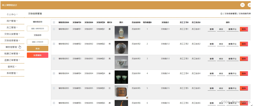 文物信息管理,在文物信息管理页面可以对博物馆名称,文物编号,文物名称,文物类型,朝代,图片,历史时间,现存数量,文物简介,员工工号,员工姓名等内容进行查看评论,查看,修改,删除操作,如图5-11所示。