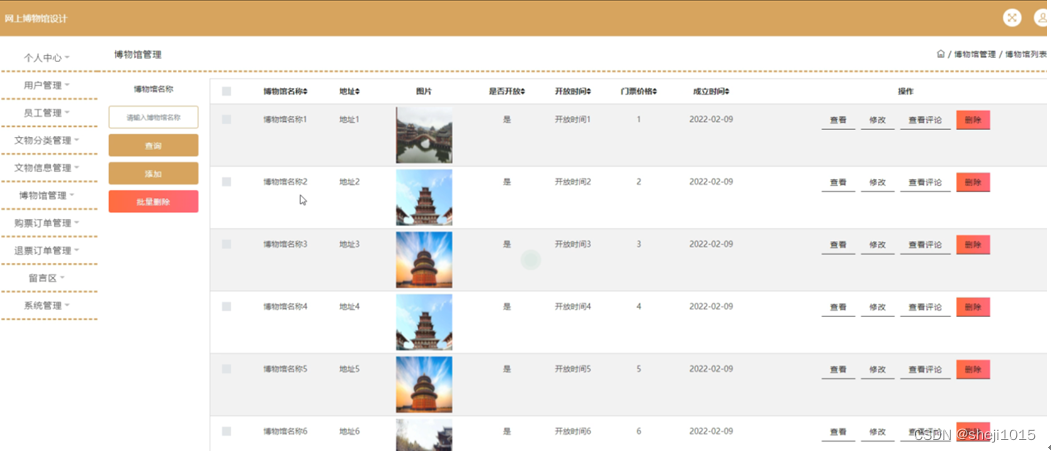 博物馆管理,在博物馆管理页面可以对博物馆名称,地址,图片,是否开放,开放时间,门票价格,成交时间等内容进行查看评论,查看,修改,删除操作,如图5-12所示。