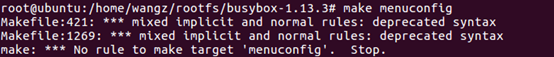 意思是混合隐式规则和常规规则:弃用语法,起初以为是busybox包的问题,换了低版本也报同样的错误,百度上说可能是由于系统make工具太新(系统:Ubuntu16.04),make旧版 的一些规则已经无法兼容新版make
