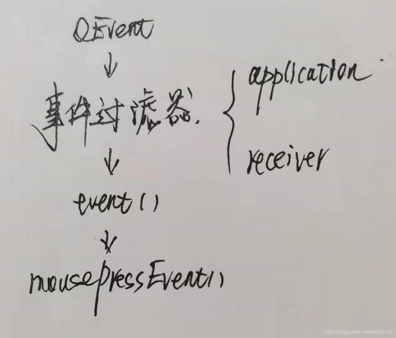 在发生事件时(比如说上面说的按下鼠标),就会产生一个 QEvent 对象(这里是QMouseEvent,为 QEvent 的子类),这个 QEvent 对象会按照下图所示的流程进行传递: