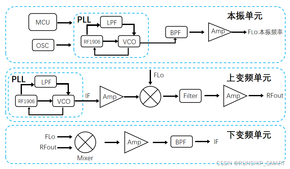 图中的RF1906是一款小数N分频频率合成器,和环路滤波器以及VCO组成锁相环,输出稳定的信号。