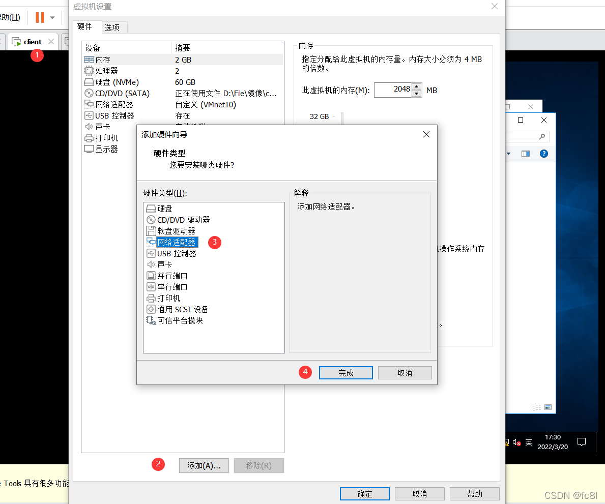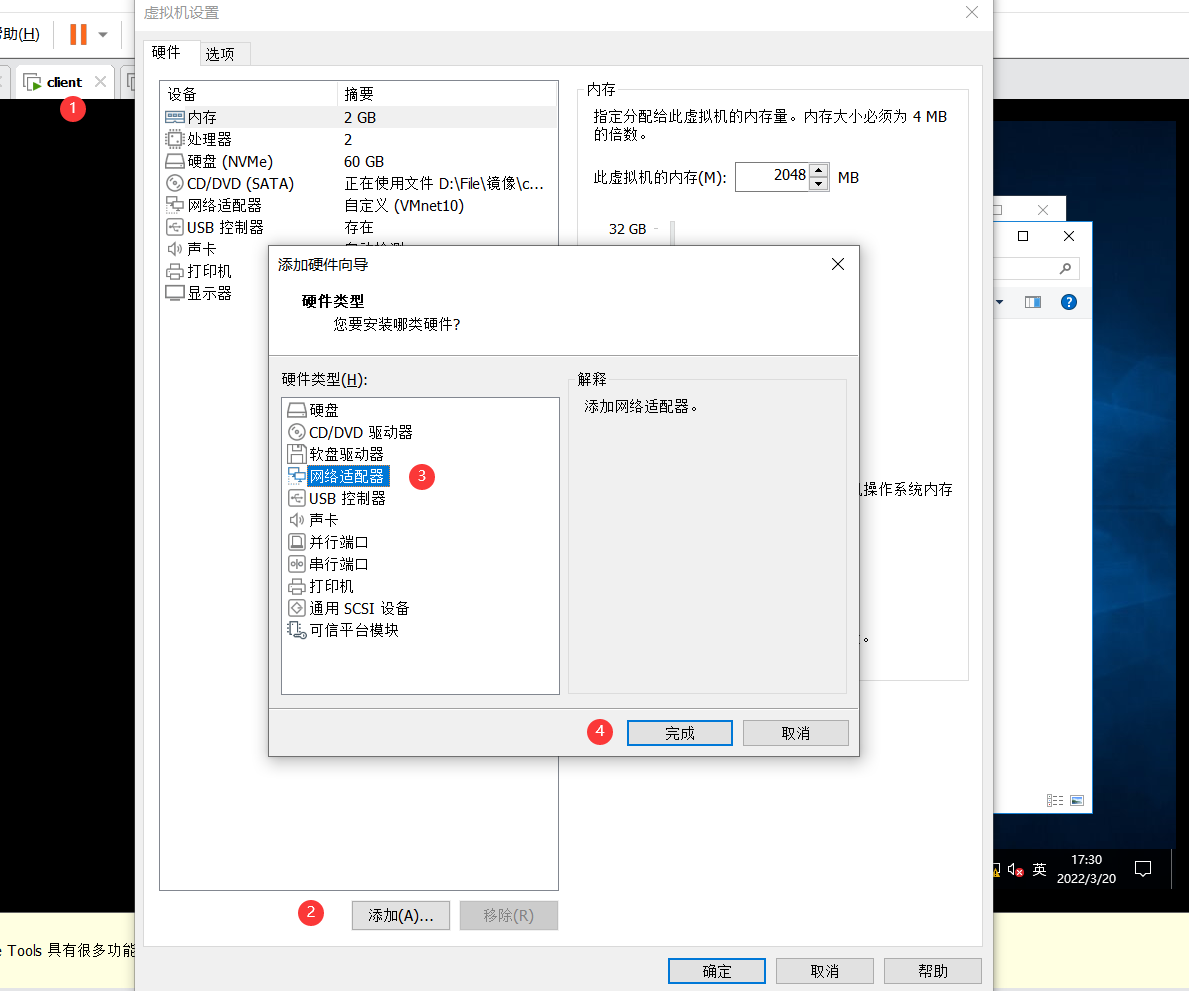 首先第一步:在客户端把 另外一张网卡VMnet 11添加进来,为了避免混淆,我们将之前的网卡改名为100,在client----右键设置----网络适配器----添加